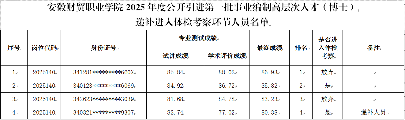 根据《安徽财贸职业学院2025年度公开引进事业编制高层次人才(博士)公告》要求,因入围2025140岗位体检考察环节的考生自愿放弃,按照规定,在同岗位报考人员中,按考试最终成绩从高分到低分依次等额递补。现将递补人员名单公布如下。