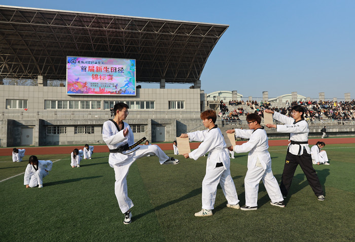 2020年12月6日,由公共教学部、学院团委联合举办的首届新生田径锦标赛在校田径场举行。开幕式在齐唱国歌中开始,来自文化创意学院的康慧汝同学和财会金融学院的薛冬同学分表代表运动员和裁判员进行宣誓,公共教学部主任王学峰代表大赛组委会致开幕词,校跆拳道协会和武术协会进行了精彩的功夫表演。