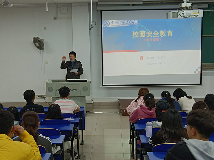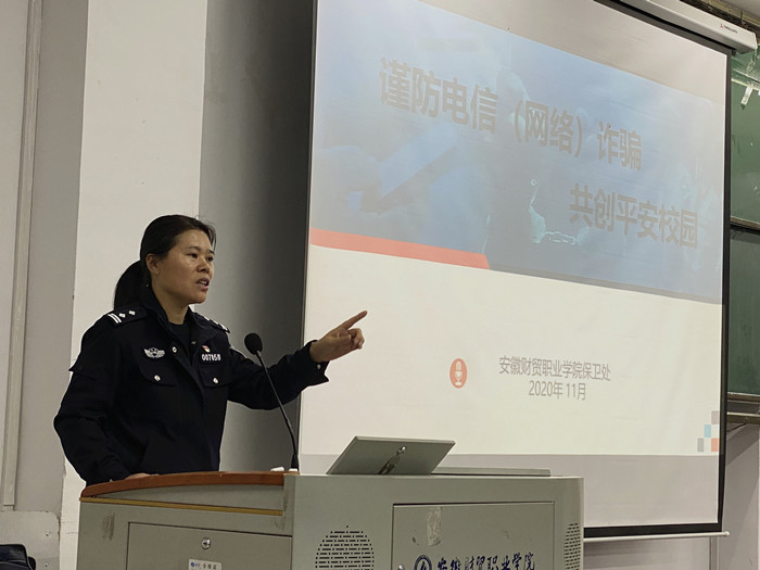 11月18日至25日,保卫处在6号教学楼开展了4期以“提高安全意识,防范电信诈骗”为主题的专题讲座。财会金融学院、经济贸易学院、文化创意学院、信息工程学院和公共教学部近1200余名新生参加了讲座。