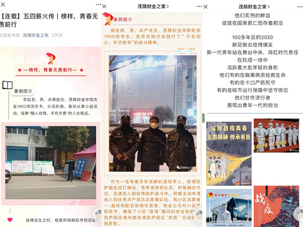 为增强制度自信,弘扬爱国情怀,提高青年学生的时代责任感和历史使命感,4月22日至5月13日,茂荫财金学院团总支通过网络开展以“绽放战‘疫’青春,坚持制度自信”主题团日系列活动。