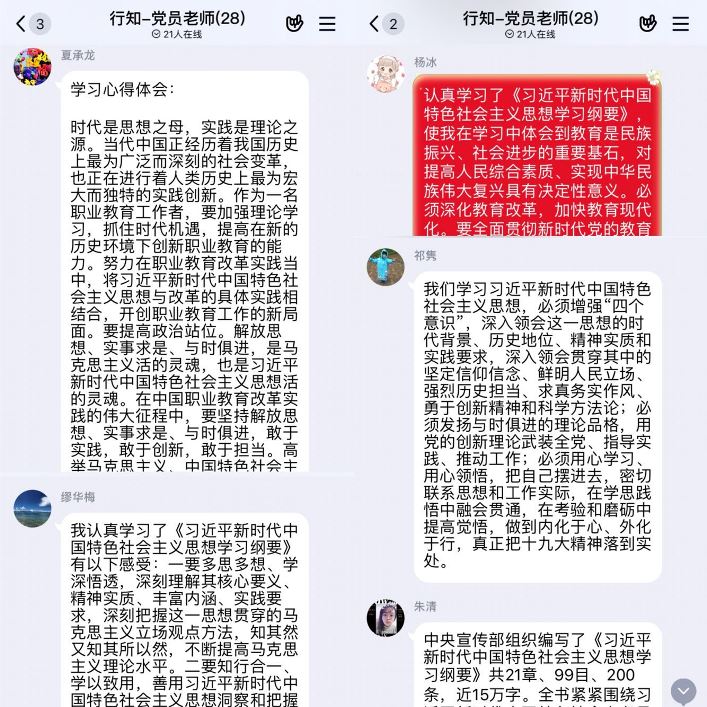 线下学习后,各支部组织了全体党员教师进行了线上分享和交流。全体党员教师纷纷表示,作为一名教师,要认真学习《纲要》,切实用习近平新时代中国特色社会主义思想武装头脑、指导实践、推动工作;在教育实践中,要在“实”字上狠下功夫,把学习《纲要》的认识体会转化为提高课程质量和水平的实际举措与扎实成效,真正用习近平新时代中国特色社会主义思想铸魂育人,引导广大学生树牢“四个意识”、坚定“四个自信”、坚决做到“两个维护”,培养立志为中国特色社会主义事业奋斗终身的有用之才。