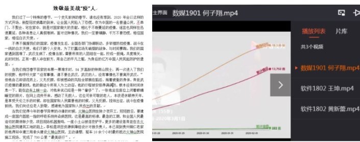 在活动期间,同学们积极响应,以海报、视频、诗歌、文章等形式表达自己对疫情的关注、对抗战在一线人员的感谢、敬仰、崇拜之情。“若要岁月静好,必要负重前行”,面对疫情,无数医护人员在充满危险的领域里,舍小家,为大家,化柔情为大爱,用他们的身躯为我们撑起一片天,为我们带来温暖。我们都在尽自己的一丝绵薄之力,防范疫情,为祖国加油!虽然我们不是医生,无法逆行而上支援一线,但我们都在为武汉加油,为中国加油,做你们的坚强的后盾,永远在后方支持你们,让你们不会孤单,在疫情面前,我们一起面对。