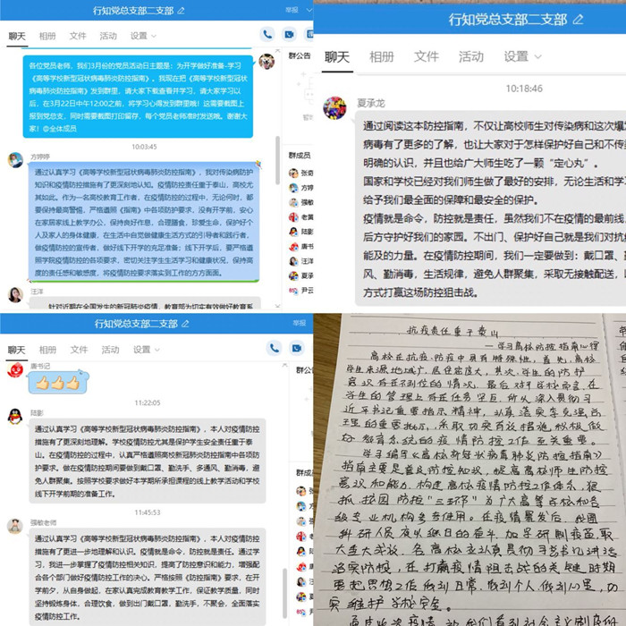 行知二支部全体党员在线学习《高等学校新型冠状病毒肺炎防护指南》。随后党员老师在支部QQ群中积极发言,大家纷纷表示:认真学习《高等学校新型冠状病毒肺炎防护指南》,让我们充分的认识了新型冠状病毒肺炎的性质,新冠肺炎症状、就医、隔离与治疗的基本知识,掌握预防措施、心理支持以及营养建议与运动支持为我们科学的开展当前的新冠肺炎防控工作提供了指导性方法。我们要切实增强紧迫感和责任感,高度重视防控工作,通过各种网络渠道为学生发放假期生活提示,开展健康教育,宣传普及疫情防治知识和防控要求,引导做好防控。上下一心,共同抗“疫”,在全国各民族齐心协力下,有效处置疫情,严格落实疫情防扩散措施,争取防疫攻坚战的最后胜利。