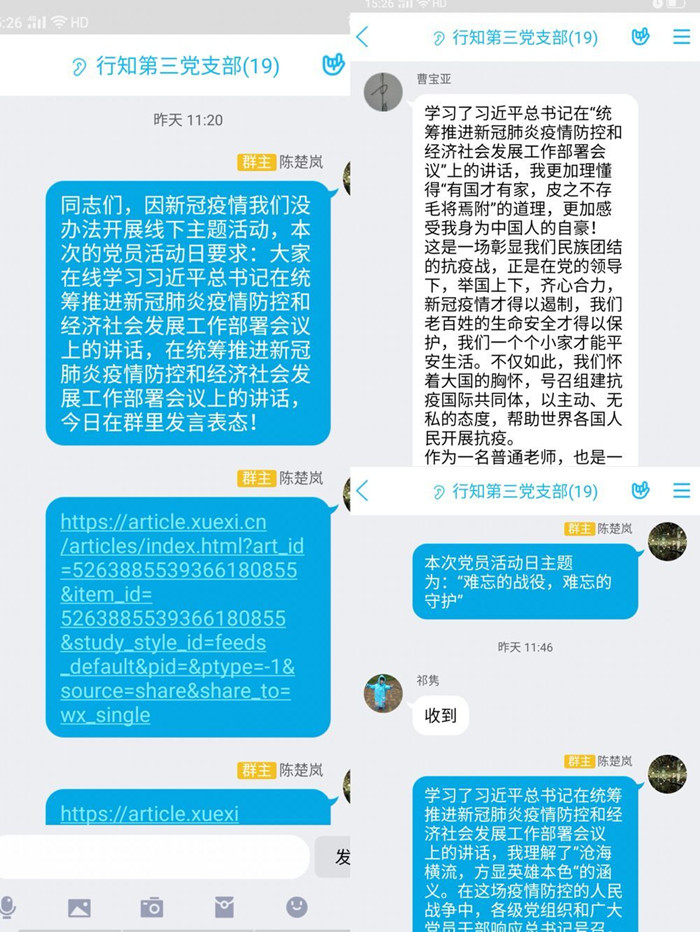 疫情防控时期,行知一支部结合工作实际,按照党日活动“线上为主、线下为辅”的原则,全体党员教师在做好个人防护的前提下,居家利用手机电脑等设备进行线上学习,并认真做好学习笔记。大家认真学习《习近平在统筹推进新冠肺炎疫情防控和经济社会发展工作部署会议上的讲话》电子文稿,观看《我是党员 战疫情 冲在前》的微视频和《人民战“疫”特别节目“高校战‘疫’”》等系列节目,聆听了专门为抗击疫情谱写的歌曲《跟我上》。