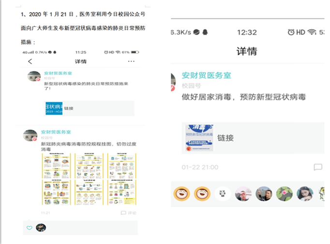 重视宣传,科学防控,普及新冠肺炎防控知识。自1月21日起,学校医务室在今日校园医务室公众号面向广大师生发布新冠肺炎防控知识,日常预防措施、居家消毒及消毒流程等信息。在校园行政楼和食堂、综合楼等醒目位置利用新冠肺炎防控知识宣传画,利用QQ群等正确指导师生员工在公众场合如何佩戴符合规定的口罩,做好自身防护措施。