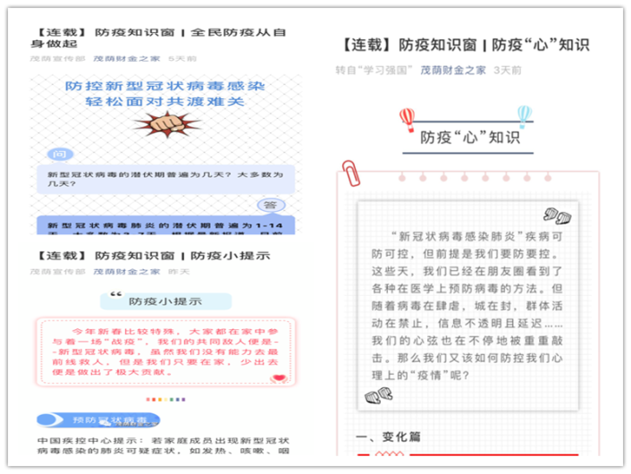 “学习防疫知识,增强抗疫信心”线上学习活动。活动以“茂荫财金之家”公众号为宣传载体,开辟“防疫知识窗”连载,普及疫情防控知识,开展防控宣传。“战‘疫’进行时,为你注入‘心’能量”栏目,筑起疫期心理防线,更加坚定青年学子共同战胜困难的信心,凝聚了特殊时期互帮互助的点滴温情。