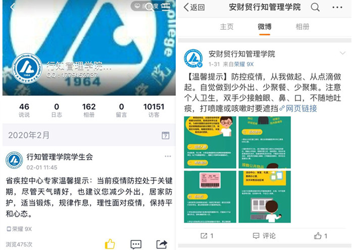 行知管理学院各班级班长组织全体同学们观看了《冬去春会来》和《你的样子,就是中国的样子》等专题视频,使得同学们能够及时了解当前疫情发展动态以及国家应对的方针政策,增强青春战‘疫’,共克时艰的信心和决心。同学们还自发组织拍摄了“为武汉加油”的助力照片和小视频,各班级“能写会画”的宣传委员也在家书写了“武汉加油、中国加油”的字与画把满满的爱和祝福送给了武汉,送给了湖北,送给了所有为战胜疫情而付出的人们。与此同时,各班级团支部积极开展“中国加油,防疫健康教育”线上公益活动,并坚持完成每天的打卡任务,为战“疫”贡献自己的力量。该院学生会QQ平台、新浪微博还定期发布积极向上的正能量播报和防控疫情的温馨提示。
