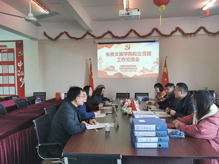 12月27日上午,朱熹文旅学院商务英语专业校企合作单位、教师企业工作站安徽轩昂教育集团董事长王磊带领总经理刘灯祥、业务总监丁茜、党建专干谢婷梅到访该院,就合肥市庐阳区标杆企业党建验收工作与朱熹文旅学院党总支开展交流研讨,该院党总支副书记宋凌云、院长刘葆、副院长钟晓鹏、宣传委员汪双、组织委员陈伟给予了热情接待。