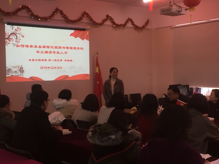 12月18日,朱熹文旅学院党总支举办“如何培养具备国际化视野与管理理论的本土酒店专业人才”为主题的微党课活动,该院党总支纪检委员钟晓鹏主讲,党总支副书记宋凌云及全体教师参加了此次学习活动。