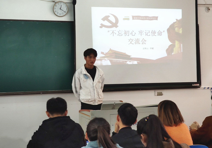 11月13日中午,该院在3104教室开展了“不忘初心、牢记使命”交流会。各位同学积极发言,各抒已见,讲述个人来到安徽财贸职业学院的初心、上大学的初心,作为财贸学生的使命与责任以及作为社会青年的使命与责任。在全体学生发言的基础上,班主任许斌提出两个思考,一是入党的初心是什么?二是中国共产党党员的使命什么?