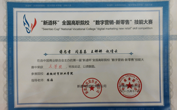 11月27日-28日,由中国商业联合会主办的“数字营销-新零售”全国高职院校技能大赛在无锡商业职业技术学院圆满落幕。由陈海老师指导的市场营销专业蒋忠孝、闫昌昌、王娜娜、赵倩云四位同学组成的安徽财贸职业学院代表队,刻苦训练,团结协作,最终夺得赛事三等奖。