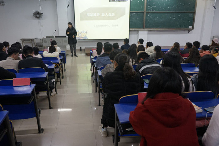 11月27日晚,第11期新生心理委员培训班第三场专题讲座在6103教室开讲,由心理健康教育中心主任汤亦瑾老师作题为《大学生朋辈心理辅导》的主题讲座。各新生班级心理委员、各院部学生会心理部学生干部等240多人参加培训讲座。
