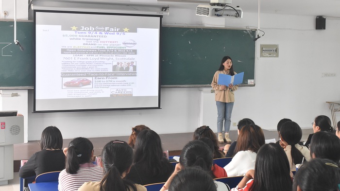 英语口语(专业组)技能比赛面向在校2018、2019级商务英语专业同学,经过前期初赛遴选,最终确定了12名选手晋级决赛。决赛环节设置职场描述和情景交流两个环节组成。职场描述部分,参赛者随机抽取一幅反映行业发展、企业业务或社会、经济等热点问题的统计图表或图片,在规定时间内用英语对其进行口头描述和观点阐述。情景交流部分,参赛者随机抽取某一场景题目,根据题目设定的角色,与主试官进行一对一的英语现场问答交流,考察参赛者的情景应变能力和口语交流能力。
