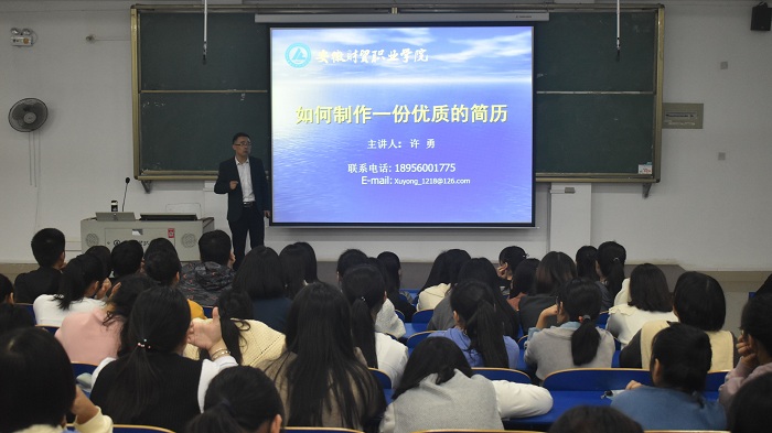许勇从“先就业,后择业”还是“先择业,后就业”这一问题展开思考与讨论,勉励同学们要树立正确的就业观,适应社会需求发展。不断修正自己的职业生涯规划,全面发展自己,提升综合素质。随后,许勇从简历的封面制作、基本结构以及简历的重要性等方面进行详细的讲解,并结合优秀毕业生的简历作为案例,进一步阐述做好一份优秀的简历的重要性。许勇强调,一份合格的求职简历包括:十秒原则、清晰原则、针对性原则、客观性原则以及真实性原则。指出,同学们要树立终身学习的观念,培养雄厚的竞争实力,满足岗位的核心要求,才能在社会上立足。讲座的最后,还进行了互动提问环节,许勇就同学们感兴趣的简历及求职问题进行了耐心细致的解答,赢得同学们阵阵掌声。