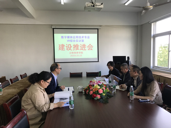 10月15日下午,云桂信息学院数字媒体专业虚拟现实VR综合实训室建设工作推进会在教师办公室召开,会议由数字媒体专业负责人徐新星老师主持,副院长张成叔和实训室建设的相关设计方和施工方代表参加了会议。