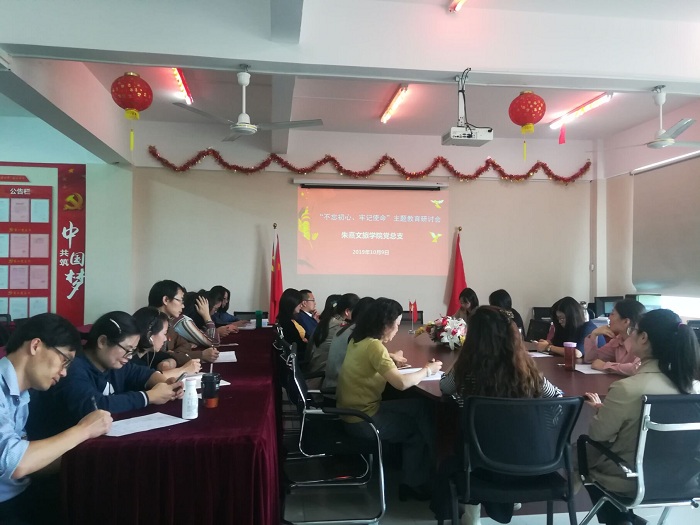 10月9日下午,朱熹文旅学院开展“不忘初心、牢记使命”主题教育研讨会,该院副院长、纪检委员钟晓鹏主持会议,第二党支部赵媛媛领学《习近平关于“不忘初心、牢记使命”论述摘要摘编》的第一章内容:中国共产党人的初心和使命,就是为中国人民谋幸福,为中华民族谋复兴。第三党支部党员教师毕筱菁、蒋廉作交流发言,全体党员教师参加了本次会议。