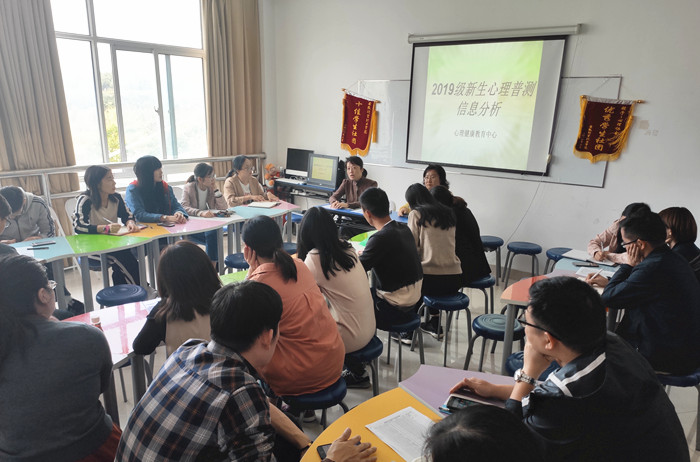 近日,学生处在心理健康教育中心团训室举办2019级新生心理普测分析研讨会,由心理健康教育中心主任汤亦瑾主任主持,各二级学院新生班级专兼职辅导员代表34人参加。