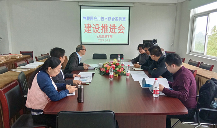 10月8日上午,云桂信息学院召开物联网应用技术专业综合实训室建设工作推进会。会议由副院长张成叔主持,北京新大陆时代教育科技有限公司区域经理洪瑞、安徽大科有道信息技术有限公司业务经理缪园富、计算机信息管理教研室主任陆慧、物联网应用技术专业负责人陈林、实训室建设装修设计单位负责人和施工单位负责人参加了会议。