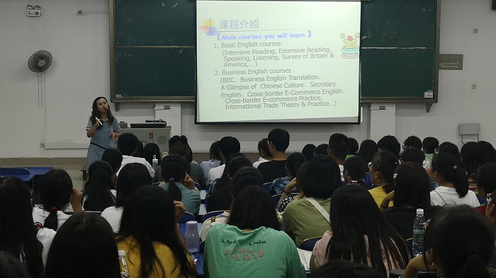 为提高商务英语专业新生对专业的认知,朱熹文旅学院特别邀请了安徽轩昂教育集团总经理汪龙参加本次新生专业教育活动。商务英语教研室主任陈伟就商务英语的专业背景、就业方向等进行了详细的介绍,并表示希望同学们对未来三年的学习生活要有合理的规划和安排,要将主动的去探索知识和清晰应变的头脑相结合。随后,汪龙对学校应用型人才培养模式给予了肯定,希望商务英语专业能培养更多优秀的专业人才,为跨境电商和对外贸易工作做好充分的人才储备。此外,汪龙还对安徽轩昂教育集团进行了介绍,欢迎同学们前往公司学习、实训,亲身体验在外贸企业工作的氛围。