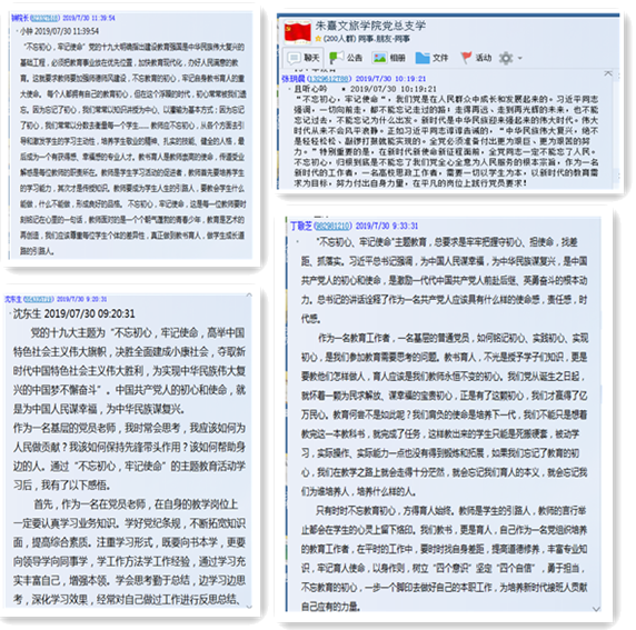 本次主题教育学习活动,朱熹文旅学院党总支充分利用“学习强国APP平台”、“文旅学院党总支QQ群”新媒体资源,采取“平台自主学习,线上讨论交流、线下自查自纠”的独特模式,取得了良好的成效。在学习过程主要通过三个环节完成:首先,党员老师通过“学习强国”、新闻、报纸、网络视频等媒体平台广泛收集“不忘初心、牢记使命”文件要求、会议精神等学习资料,通过“读原著、学原文、悟原理”的思路与方式学习相关内容;然后,老师紧密结合自己的工作岗位,进行广泛的交流,发表自己的学习心得与意见;最后,老师自己对照检查,通过找差距求实效,把问题找实、把根源挖深,引导老师开展批评与自我批评,根据自身的存在的不足提出工作改进的方案方法,逐步强化思想意识与作风意识。通过党员老师的学习、讨论与交流,大家一致认为“不忘初心、牢记使命”主题教育是一次深刻的自我剖析、自我革命活动,是一次强调“学、知、行”为一体的系统教育活动。
