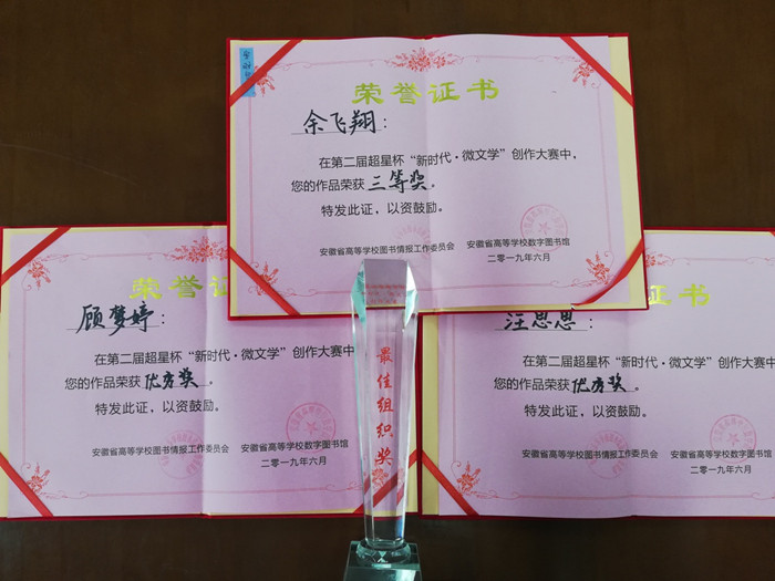 本次大赛历时2个多月,吸引了来自全国超过300所高校参与,发表作品1.45万篇,大赛活动页面点击量超过70万次。经过审稿组审核、学生投票,全国确定晋级作品240篇,后经专家组二次评选,安徽赛区确定晋级决赛作品40篇。我校税务1801班余飞翔同学的作品《写怀依前二十二韵》荣获全省“三等奖”;会计1805班顾梦婷的《不忘初心,继续前行》、商英1703班汪思思的《嗜血玫瑰》获优秀奖。会计1805顾梦婷同学的优秀作品《不忘初心,继续前行》被大赛组委会推荐给《少年博览》等省内报刊发表。我校图书信息中心在本次大赛中荣获“最佳组织奖”称号。