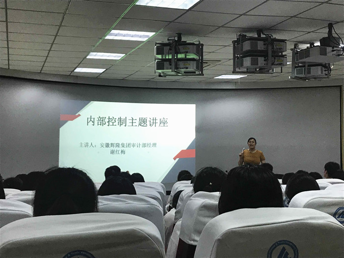 6月12日下午,安徽辉隆农资集团股份有限公司高级会计师、审计部经理谢红梅来校为“辉隆班”的学生开展了一场内部控制主题讲座,相关专业的教师也一起聆听了这场讲座,讲座由大位会计学院国会教研室主任孙敬平主持。