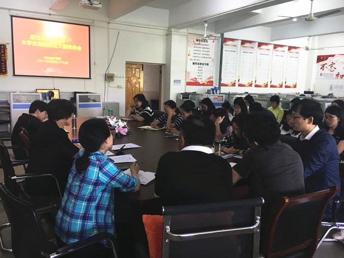 为贯彻落实《教育部关于举办第五届中国“互联网+”大学生创新创业大赛的通知》和《关于举办安徽财贸职业学院第五届“互联网+”大学生创新创业大赛的通知》精神和要求,5月29日中午,大位会计学院在系部办公室召开“互联网+”大学生创新创业大赛动员会。会议由大位会计学院副院长姚云霞主持,全体成员参加会议。