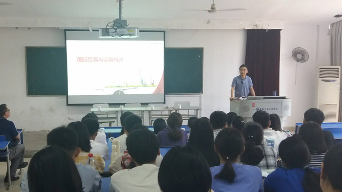 王传友系安徽农业大学农学硕士,从事国际贸易经营和管理三十年左右,先后在安徽茶叶进出口公司、安徽省供销商业总公司、安徽辉隆农资集团任职,他以自身经历鼓励学生们要端正学习态度,找对学习方法并持之以恒,未来一定可期。随后,王传友从国际贸易的基本概念、国际贸易术语与惯例、进出口商品概述、国际货物运输和保险、进出口合同的签订与履行、外汇核算和国际结算以及我省供销系统国际贸易现状等七个方面展开了讲解,并结合工作中的案例,让学生们眼中艰深晦涩的知识点变得生动、有趣、通俗易懂。在场的学生们听得津津有味,认真做笔记,受益匪浅。