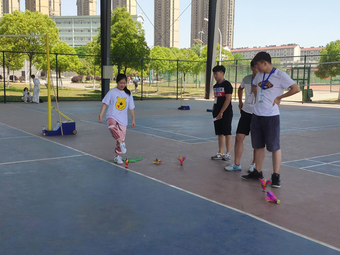 与传统运动会相比,趣味运动会将竞技与娱乐相结合,着重鼓励学生合作参与,充分发扬团体合作精神,参赛人员两人一组,第一个队员从起始点跳绳赶到终点,完成五次踢毽子,再由终点返回起点,将跳绳交给第二位队员进行同样的步骤,两人完成的总时间为总成绩。按用时成绩排名次,用时最短为第一名。