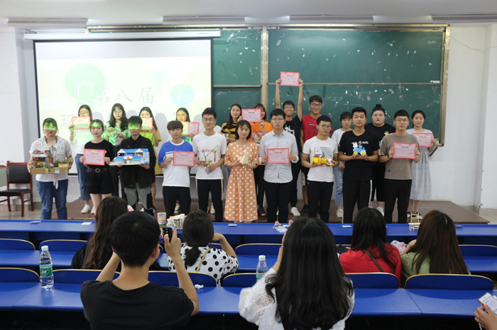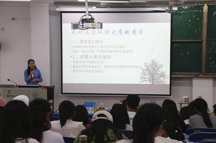 本次活动面向全校同学进行作品征集,经过一周的宣传,共收集参赛作品 108件。经初赛和复赛,最终15件优秀作品脱颖而出进入决赛。决赛现场,有废弃的宣传单做成的一个灯笼模型,有废弃的纸箱做成的美丽的海景房,有不用的水瓶盖做成轮船……构思巧妙的作品令人目不暇接,参赛作者分别上台依次对各自的作品通过PPT的方式进行解说,各组选手们的共同点就是体现在作品中变废为宝的意识,提倡更好的节约资源,保护环境。最后,房产1801班宋姿蓉、刘振东两位同学的组合摘得桂冠,人资1801班的刘明月、高职1603班的万海洋和工商1801班的李鑫望、夏正龙两队组合获得二等奖,物流1801班的孙豪杰、王园静,商英1801班的傅晶晶、杨津洁、李雨欣和人资1802班王雨艳、胡学茹等三队组合获得三等奖。
