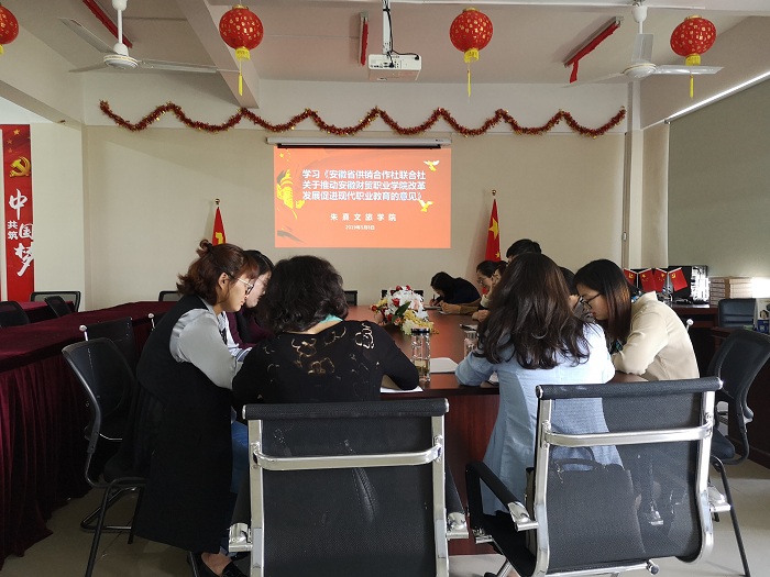 5月8日下午,全体教师齐聚学院办公室,共同学习《安徽省供销合作社联合社关于推动安徽财贸职业学院改革发展促进现代职业教育的意见》。此次学习活动由党总支纪检委员、副院长钟晓鹏负责组织,第一党支部宣传委员兼纪检委员何静娣领学《安徽省供销合作社联合社关于推动安徽财贸职业学院改革发展促进现代职业教育的意见》(以下简称《意见》)。