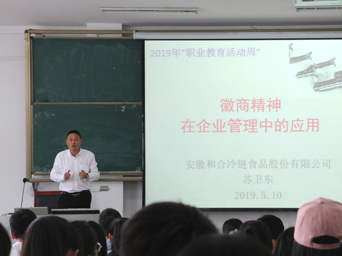5月10日下午,行知管理学院兼职院长、我校客座教授、安徽和合冷链食品股份有限公司常务副总经理苏卫东,在我校6302教室做了一场“徽商精神在企业管理中的应用”的专题讲座,安徽省冷链物流协会、安徽和合冷链食品股份有限公司和安徽供销建设投资股份有限公司的嘉宾以及行知管理学院部分师生共200多人参加了本次讲座,讲座由行知管理学院党总支副书记唐学华主持。