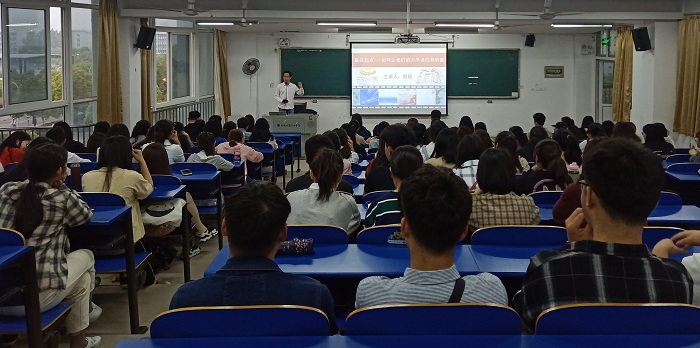 4月22日晚,本学期“中华传统文化大讲堂”第二期在6301教室举办。本期的主题为“赢在起点——如何让我们的大学读的有质量”,由国家企业培训师、安徽省教育厅厅评副教授赵俊主讲,朱熹文旅学院全体学生干部及2018级学生代表聆听了讲座。