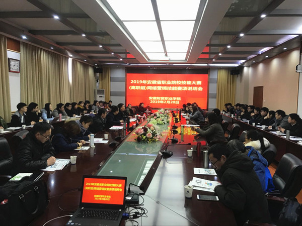 2月20日下午,2019年安徽省职业院校技能大赛(高职组)“网络营销技能”赛项说明会顺利举行,雪岩贸易学院院长郭湘如、营销教研室主任江友农、中教畅享(北京)科技有限公司副总潘洪锋、安徽金专营销管理有限责任公司总经理曾劲松、副总经理麻先锋共同主持会议。