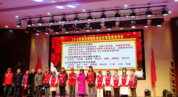 宾虹艺术学院爱心志愿服务队参与南站志愿服务工作自加入“高铁南站志愿服务联合会”至今从未间断,志愿服务队为旅客服务立足于“转乘指引、搬运送站、重点帮扶”等常规志愿服务项目,此外,宾虹志愿者发挥专业优势,为南站志愿服务公益成员开展服务礼仪培训、新闻写作培训、摄影培训等。三年来,累计参与合肥南站志愿服务2100人次,志愿服务总时间长780小时,惠及数千名旅客。本次表彰大会对安徽财贸学院全体志愿者在过去一年中作出的努力和奉献给予了充分的认可和赞扬,为志愿者提供了展示自己的舞台,回顾了他们风雨无阻的坚持,渗透了他们默默挥洒的汗水。