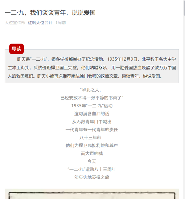 铭记历史、立足今天、展望未来。为响应校团委关于开展“铭记一二九,弘扬爱国志”主题团日活动的相关文件精神,大位会计学院利用微信公众号“红帆大位会计”积极宣传,并安排各班团支部开展了以此为主题的口语训练活动。