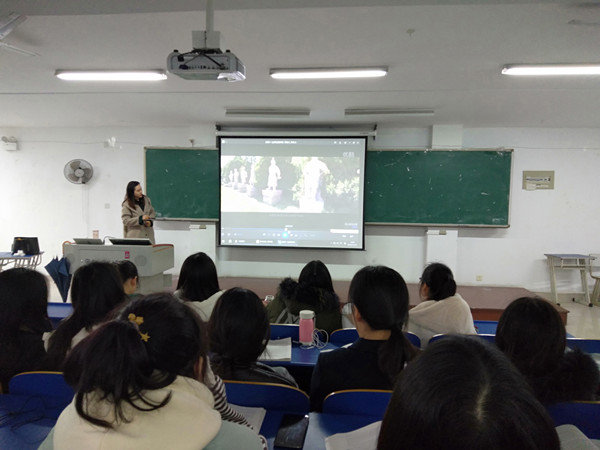陈伟首先用英文讲述了“嫘祖养蚕”的故事,调动了学生的兴趣和积极性。随后,通过播放NHK纪录片《新丝绸之路》,帮助学生更加全面的了解了丝绸之路的起源、历史、路线以及现存的遗址等,认识到了丝绸之路在中国古代经济贸易与文化交流中所发挥的重要作用。在此基础上,陈伟详细介绍了中华民族服饰的演变,并借视频《华夏之赏》来展示各民族、朝代服饰的特点。其中,重点介绍了中国传统丝织工艺品—宋锦的制作过程及其成品,体现了我国古代劳动人民的智慧和勤劳本色。讲座最后的课堂交流互动环节中,陈伟耐心地解答了同学们的疑问。同学们纷纷表示受益匪浅,对中国服饰有了更加深入的了解和认识,感慨中国传统文化的博大精深。