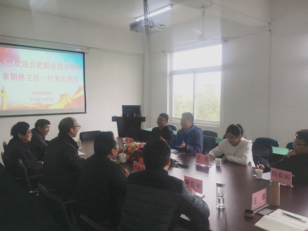 章炳林介绍了合肥职业技术学院的发展概况,计算机学院实验室建设所取得的成就,重点介绍了物联网专业发展的创新和亮点,以及在内涵建设、师资队伍、人才培养方案上的发展与不足之处。随后,双方就各自关心的问题进行了深入的对口交流。