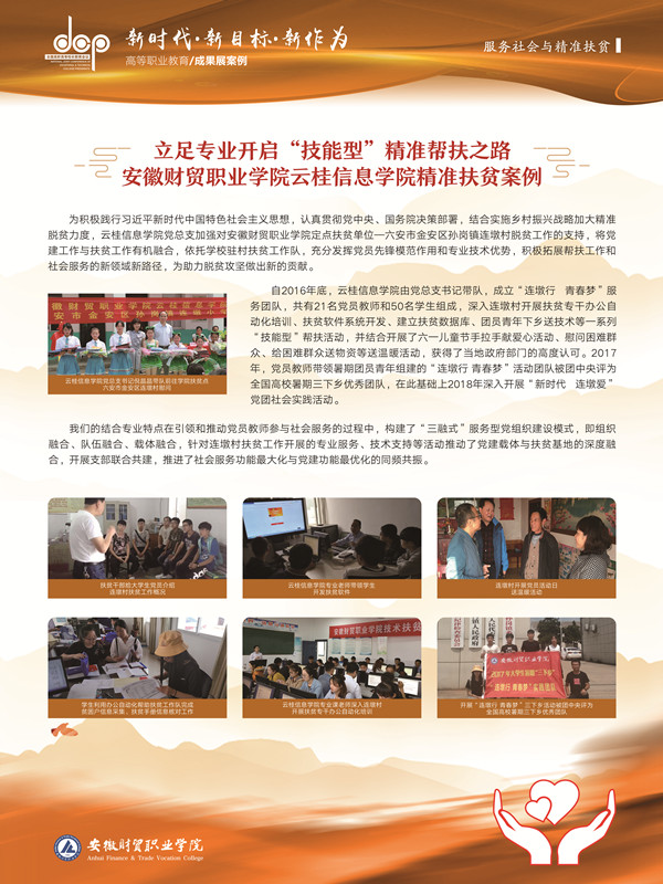 云桂信息学院自2016年底,由党总支书记倪晶晶带队,成立“连墩行 青春梦”服务团队,立足专业特点,深入连墩村开启一系列办公自动化培训、扶贫软件系统开发、建立扶贫数据库等“技能型”帮扶活动,并结合社会服务,构建了“三融式”服务型党组织建设模式,推动我院党建载体与扶贫基地的深度融合,获得了当地政府部门的高度认可。