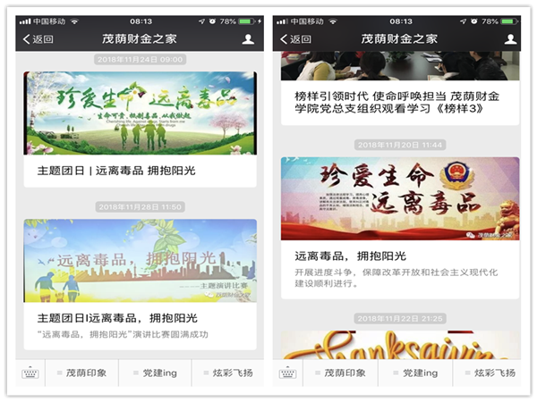 为落实校团委《关于开展“远离毒品,拥抱阳光”主题团日活动的通知》文件精神,加强校园禁毒宣传力度,提高大学生禁毒意识,近日,茂荫财金学院团总支深入开展主题团日系列活动,多形式多渠道传播正能量。 团总支巧用网络新媒体,打造网络宣传新阵地。通过“茂荫财金之家”微信公众号平台,积极推广禁毒知识、相关法律法规、禁毒新闻等。各班团支部积极开展学习活动,利用公众号开展学习互动。
