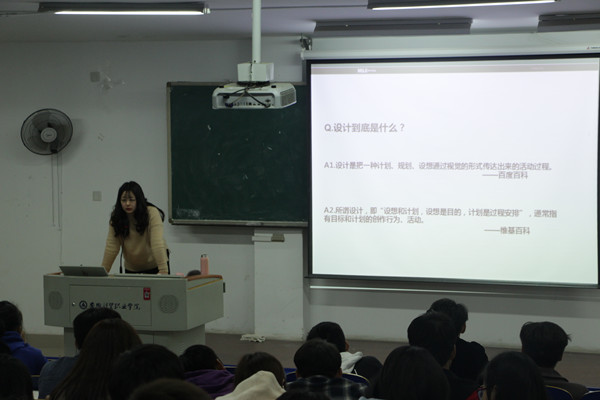 11月22日晚,第八期翡翠艺术大讲堂第二讲开讲,主讲人宾虹艺术学院专职教师高海燕作“设计是什么”主题讲座,2017、2018级共计200人聆听了本次讲座。