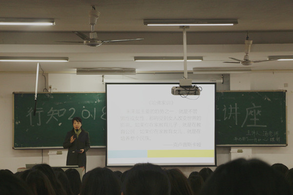 为加强女生心理健康教育,11月21日下午,行知管理学院邀请学生处心理咨询室主任汤亦瑾为2018级300余名女生开展了一场大学女生心理健康知识讲座。