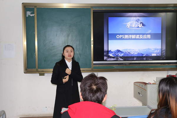雷云云为此次高管进课堂做了充分的准备,提前将二维码发给同学们测试职业性格,课堂上雷经理为同学们分析在自然状态下和工作状态中的性格。她主要从ops简介、ops四种人格类型分析、ops报告解读和ops应用—提升沟通与合作四个方面做了详细介绍,分析了四种人格类型的优缺点,帮助同学们了解不同类型的人应该如何更好的应对。以外,雷云云还分享了自己的工作经验,用自己的亲身经历告诉同学们如何更高效的做好工作,赢得了同学们的阵阵掌声。
