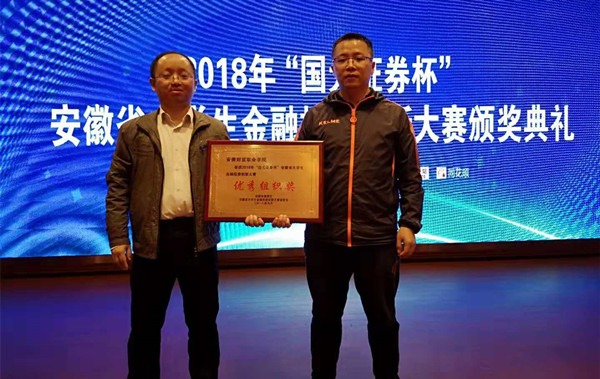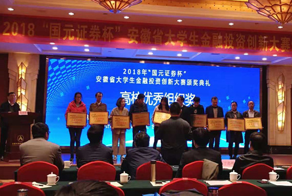 2018“国元证券杯”安徽省大学生金融投资创新大赛颁奖典礼于近日在安徽财经大学举行,我校参赛师生团队斩获5个一等奖,7个二等奖和28个三等奖,学校再次被授予“高校优秀组织奖。