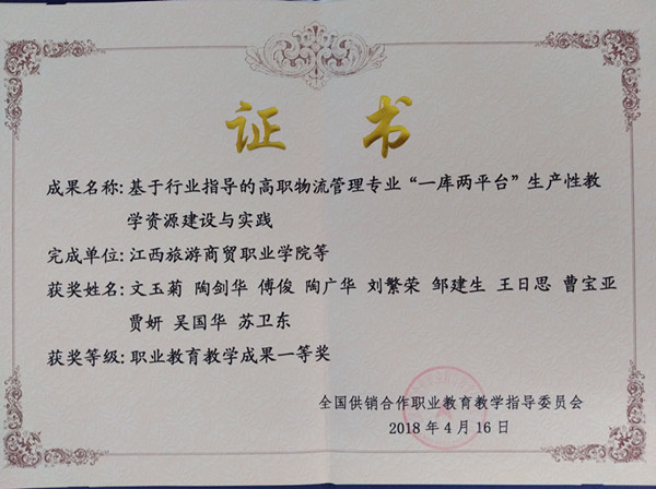 近日,全国供销合作职业教育教学指导委员会公布了2018年度教学成果奖评审情况,由我校(第二完成单位)行知管理学院联合供销系统其它三所高职院校及一家企业共同申报的《基于行业指导的高职物流管理专业“一库两平台”生产性教学资源建设与实践》喜获教学成果奖一等奖。