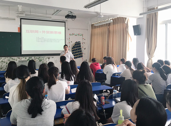 王斌从传统外贸流程讲起,详细阐述了在互联网影响下国际贸易新思维新发展,外贸企业现在主要利用B2B、B2C跨境电子商务平台上进行产品推广、进出口交易磋商、进出口合同的缮制审核、业务履行沟通等工作。王斌提出,国商专业学生在校期间要培养熟练使用B2B、B2C跨境电子商务平台上进行外贸业务沟通、外贸业务单据处理等能力。他鼓励在场的每一位同学,要通过自己的不懈努力成为一名优秀的外贸人。