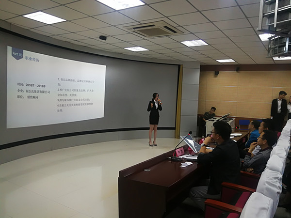 本次大赛模拟真实面试流程,共分为两部分。参赛选手先递交求职简历,评委老师根据简历内容的创意性、独特性与真实性进行量化打分。随后参赛选手上台做简短的自我介绍,并通过PPT演讲方式展示自身特点,评委老师根据现场同学的表现进行随机提问,并根据选手的应变能力进行量化打分。