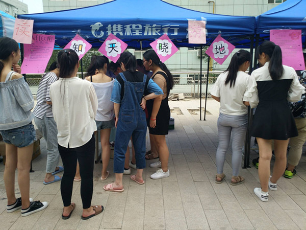 5月15日下午,读书协会的会员们早早便来到食堂西侧宣传栏处忙碌地布置活动场地,搭棚子、贴海报、挂奖品,三个简易遮阳棚很快便被同学们装饰得五彩缤纷、光鲜夺目。下午4点,活动准时开始。诗词达人、成语大会、知天晓地、心有灵犀等精心设计的游戏项目既精彩又有趣,不仅要求参与者要有丰富的词汇积累,而且必须反应迅速。活动吸引了400多位同学的踊跃参与,现场几个项目的展位气氛都十分活跃,同学们沉浸在阅读带来的快乐中,不时传来“我又想起一个”“我再猜一个”的声音。