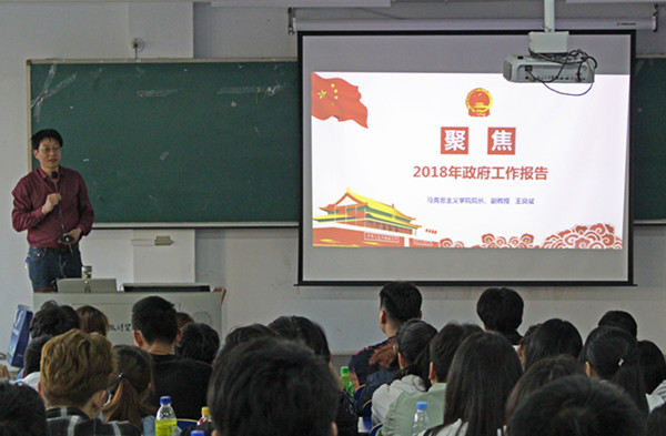 王良斌以《新征程,朝着伟大梦想前进——聚焦2018政府工作报告》为主题,解析了本次政府工作报告的来源及特点,从“过去五年的工作回顾、2018年经济社会发展总体要求、对2018年的经济建设的展望”这三个方面给同学们们阐述2018年政府工作报告的具体内容。讲解深入浅出、语调幽默风趣、示例形象生动,引来现场同学们地阵阵喝彩。他勉励同学们“不忘初心跟党走,青春建功新时代”,希望同学们立志做一名栋梁之才。