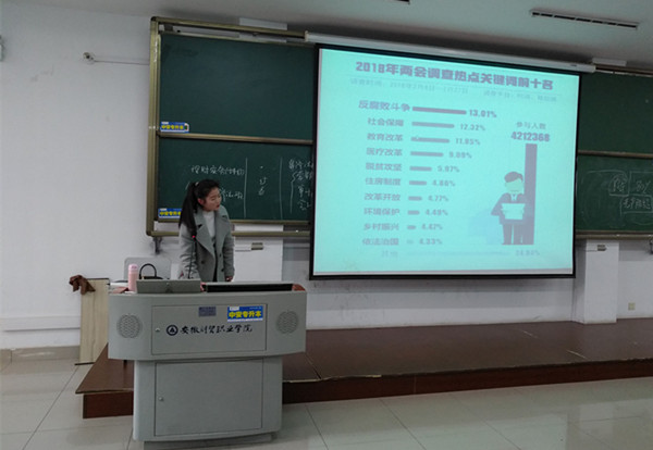 张瑞琪老师采取课堂实训的形式,要求同学们课下收集资料,课上分享2018年两会中的热点词汇和热点话题,并介绍自己对此次两会的关注点和聚焦点,并结合事例进行典型阐述。